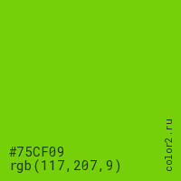 Цвет #75CF09 в цветовой модели RGB обозначается тремя октетами (117, 207, 9) в десятичном формате и #75CF09 в шестнадцатиричном (hex) формате, которые являются интенсивностью красного 117 (hex 75), интенсивность зелёного 207 (hex CF) и интенсивность синего 9 (hex 09).