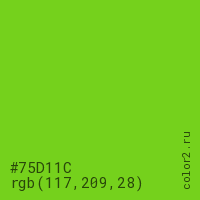 Цвет #75D11C в цветовой модели RGB обозначается тремя октетами (117, 209, 28) в десятичном формате и #75D11C в шестнадцатиричном (hex) формате, которые являются интенсивностью красного 117 (hex 75), интенсивность зелёного 209 (hex D1) и интенсивность синего 28 (hex 1C).