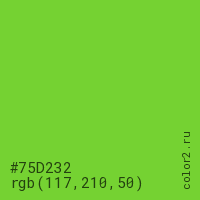 Цвет #75D232 в цветовой модели RGB обозначается тремя октетами (117, 210, 50) в десятичном формате и #75D232 в шестнадцатиричном (hex) формате, которые являются интенсивностью красного 117 (hex 75), интенсивность зелёного 210 (hex D2) и интенсивность синего 50 (hex 32).