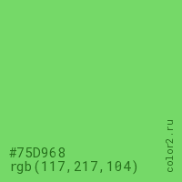 Цвет #75D968 в цветовой модели RGB обозначается тремя октетами (117, 217, 104) в десятичном формате и #75D968 в шестнадцатиричном (hex) формате, которые являются интенсивностью красного 117 (hex 75), интенсивность зелёного 217 (hex D9) и интенсивность синего 104 (hex 68).