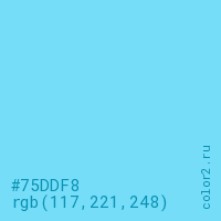 Цвет #75DDF8 в цветовой модели RGB обозначается тремя октетами (117, 221, 248) в десятичном формате и #75DDF8 в шестнадцатиричном (hex) формате, которые являются интенсивностью красного 117 (hex 75), интенсивность зелёного 221 (hex DD) и интенсивность синего 248 (hex F8).
