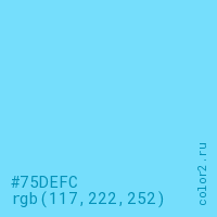 Цвет #75DEFC в цветовой модели RGB обозначается тремя октетами (117, 222, 252) в десятичном формате и #75DEFC в шестнадцатиричном (hex) формате, которые являются интенсивностью красного 117 (hex 75), интенсивность зелёного 222 (hex DE) и интенсивность синего 252 (hex FC).