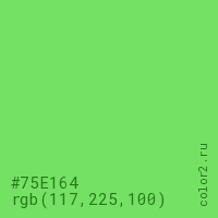 Цвет #75E164 в цветовой модели RGB обозначается тремя октетами (117, 225, 100) в десятичном формате и #75E164 в шестнадцатиричном (hex) формате, которые являются интенсивностью красного 117 (hex 75), интенсивность зелёного 225 (hex E1) и интенсивность синего 100 (hex 64).
