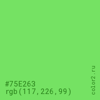 Цвет #75E263 в цветовой модели RGB обозначается тремя октетами (117, 226, 99) в десятичном формате и #75E263 в шестнадцатиричном (hex) формате, которые являются интенсивностью красного 117 (hex 75), интенсивность зелёного 226 (hex E2) и интенсивность синего 99 (hex 63).