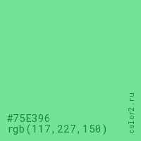 Цвет #75E396 в цветовой модели RGB обозначается тремя октетами (117, 227, 150) в десятичном формате и #75E396 в шестнадцатиричном (hex) формате, которые являются интенсивностью красного 117 (hex 75), интенсивность зелёного 227 (hex E3) и интенсивность синего 150 (hex 96).