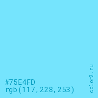 Цвет #75E4FD в цветовой модели RGB обозначается тремя октетами (117, 228, 253) в десятичном формате и #75E4FD в шестнадцатиричном (hex) формате, которые являются интенсивностью красного 117 (hex 75), интенсивность зелёного 228 (hex E4) и интенсивность синего 253 (hex FD).