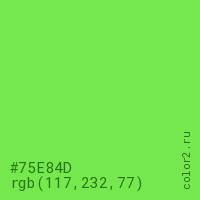 Цвет #75E84D в цветовой модели RGB обозначается тремя октетами (117, 232, 77) в десятичном формате и #75E84D в шестнадцатиричном (hex) формате, которые являются интенсивностью красного 117 (hex 75), интенсивность зелёного 232 (hex E8) и интенсивность синего 77 (hex 4D).