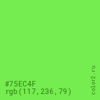 Цвет #75EC4F в цветовой модели RGB обозначается тремя октетами (117, 236, 79) в десятичном формате и #75EC4F в шестнадцатиричном (hex) формате, которые являются интенсивностью красного 117 (hex 75), интенсивность зелёного 236 (hex EC) и интенсивность синего 79 (hex 4F).