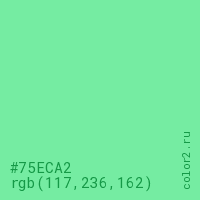 Цвет #75ECA2 в цветовой модели RGB обозначается тремя октетами (117, 236, 162) в десятичном формате и #75ECA2 в шестнадцатиричном (hex) формате, которые являются интенсивностью красного 117 (hex 75), интенсивность зелёного 236 (hex EC) и интенсивность синего 162 (hex A2).