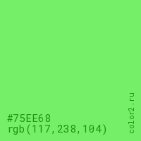 Цвет #75EE68 в цветовой модели RGB обозначается тремя октетами (117, 238, 104) в десятичном формате и #75EE68 в шестнадцатиричном (hex) формате, которые являются интенсивностью красного 117 (hex 75), интенсивность зелёного 238 (hex EE) и интенсивность синего 104 (hex 68).