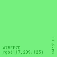 Цвет #75EF7D в цветовой модели RGB обозначается тремя октетами (117, 239, 125) в десятичном формате и #75EF7D в шестнадцатиричном (hex) формате, которые являются интенсивностью красного 117 (hex 75), интенсивность зелёного 239 (hex EF) и интенсивность синего 125 (hex 7D).