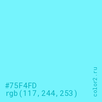 Цвет #75F4FD в цветовой модели RGB обозначается тремя октетами (117, 244, 253) в десятичном формате и #75F4FD в шестнадцатиричном (hex) формате, которые являются интенсивностью красного 117 (hex 75), интенсивность зелёного 244 (hex F4) и интенсивность синего 253 (hex FD).
