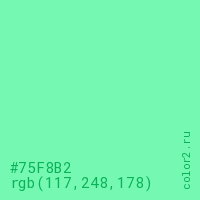 Цвет #75F8B2 в цветовой модели RGB обозначается тремя октетами (117, 248, 178) в десятичном формате и #75F8B2 в шестнадцатиричном (hex) формате, которые являются интенсивностью красного 117 (hex 75), интенсивность зелёного 248 (hex F8) и интенсивность синего 178 (hex B2).