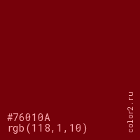 Цвет #76010A в цветовой модели RGB обозначается тремя октетами (118, 1, 10) в десятичном формате и #76010A в шестнадцатиричном (hex) формате, которые являются интенсивностью красного 118 (hex 76), интенсивность зелёного 1 (hex 01) и интенсивность синего 10 (hex 0A).
