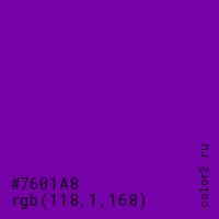 Цвет #7601A8 в цветовой модели RGB обозначается тремя октетами (118, 1, 168) в десятичном формате и #7601A8 в шестнадцатиричном (hex) формате, которые являются интенсивностью красного 118 (hex 76), интенсивность зелёного 1 (hex 01) и интенсивность синего 168 (hex A8).