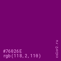Цвет #76026E в цветовой модели RGB обозначается тремя октетами (118, 2, 110) в десятичном формате и #76026E в шестнадцатиричном (hex) формате, которые являются интенсивностью красного 118 (hex 76), интенсивность зелёного 2 (hex 02) и интенсивность синего 110 (hex 6E).