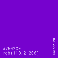 Цвет #7602CE в цветовой модели RGB обозначается тремя октетами (118, 2, 206) в десятичном формате и #7602CE в шестнадцатиричном (hex) формате, которые являются интенсивностью красного 118 (hex 76), интенсивность зелёного 2 (hex 02) и интенсивность синего 206 (hex CE).