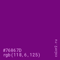 Цвет #76067D в цветовой модели RGB обозначается тремя октетами (118, 6, 125) в десятичном формате и #76067D в шестнадцатиричном (hex) формате, которые являются интенсивностью красного 118 (hex 76), интенсивность зелёного 6 (hex 06) и интенсивность синего 125 (hex 7D).