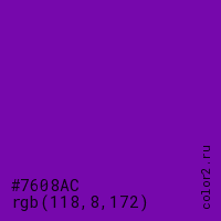 Цвет #7608AC в цветовой модели RGB обозначается тремя октетами (118, 8, 172) в десятичном формате и #7608AC в шестнадцатиричном (hex) формате, которые являются интенсивностью красного 118 (hex 76), интенсивность зелёного 8 (hex 08) и интенсивность синего 172 (hex AC).
