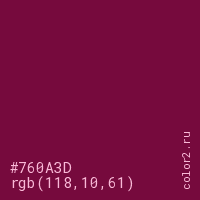 Цвет #760A3D в цветовой модели RGB обозначается тремя октетами (118, 10, 61) в десятичном формате и #760A3D в шестнадцатиричном (hex) формате, которые являются интенсивностью красного 118 (hex 76), интенсивность зелёного 10 (hex 0A) и интенсивность синего 61 (hex 3D).