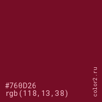 Цвет #760D26 в цветовой модели RGB обозначается тремя октетами (118, 13, 38) в десятичном формате и #760D26 в шестнадцатиричном (hex) формате, которые являются интенсивностью красного 118 (hex 76), интенсивность зелёного 13 (hex 0D) и интенсивность синего 38 (hex 26).
