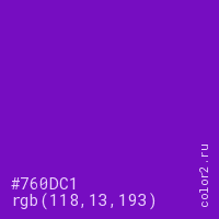 Цвет #760DC1 в цветовой модели RGB обозначается тремя октетами (118, 13, 193) в десятичном формате и #760DC1 в шестнадцатиричном (hex) формате, которые являются интенсивностью красного 118 (hex 76), интенсивность зелёного 13 (hex 0D) и интенсивность синего 193 (hex C1).