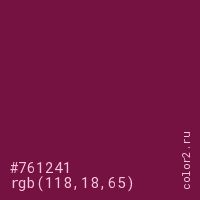 Цвет #761241 в цветовой модели RGB обозначается тремя октетами (118, 18, 65) в десятичном формате и #761241 в шестнадцатиричном (hex) формате, которые являются интенсивностью красного 118 (hex 76), интенсивность зелёного 18 (hex 12) и интенсивность синего 65 (hex 41).