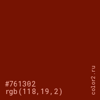 Цвет #761302 в цветовой модели RGB обозначается тремя октетами (118, 19, 2) в десятичном формате и #761302 в шестнадцатиричном (hex) формате, которые являются интенсивностью красного 118 (hex 76), интенсивность зелёного 19 (hex 13) и интенсивность синего 2 (hex 02).