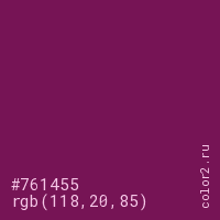 Цвет #761455 в цветовой модели RGB обозначается тремя октетами (118, 20, 85) в десятичном формате и #761455 в шестнадцатиричном (hex) формате, которые являются интенсивностью красного 118 (hex 76), интенсивность зелёного 20 (hex 14) и интенсивность синего 85 (hex 55).