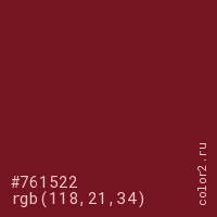 Цвет #761522 в цветовой модели RGB обозначается тремя октетами (118, 21, 34) в десятичном формате и #761522 в шестнадцатиричном (hex) формате, которые являются интенсивностью красного 118 (hex 76), интенсивность зелёного 21 (hex 15) и интенсивность синего 34 (hex 22).