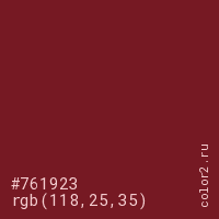 Цвет #761923 в цветовой модели RGB обозначается тремя октетами (118, 25, 35) в десятичном формате и #761923 в шестнадцатиричном (hex) формате, которые являются интенсивностью красного 118 (hex 76), интенсивность зелёного 25 (hex 19) и интенсивность синего 35 (hex 23).