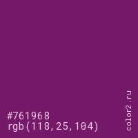 Цвет #761968 в цветовой модели RGB обозначается тремя октетами (118, 25, 104) в десятичном формате и #761968 в шестнадцатиричном (hex) формате, которые являются интенсивностью красного 118 (hex 76), интенсивность зелёного 25 (hex 19) и интенсивность синего 104 (hex 68).