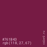 Цвет #761B43 в цветовой модели RGB обозначается тремя октетами (118, 27, 67) в десятичном формате и #761B43 в шестнадцатиричном (hex) формате, которые являются интенсивностью красного 118 (hex 76), интенсивность зелёного 27 (hex 1B) и интенсивность синего 67 (hex 43).