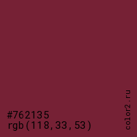 Цвет #762135 в цветовой модели RGB обозначается тремя октетами (118, 33, 53) в десятичном формате и #762135 в шестнадцатиричном (hex) формате, которые являются интенсивностью красного 118 (hex 76), интенсивность зелёного 33 (hex 21) и интенсивность синего 53 (hex 35).