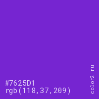 Цвет #7625D1 в цветовой модели RGB обозначается тремя октетами (118, 37, 209) в десятичном формате и #7625D1 в шестнадцатиричном (hex) формате, которые являются интенсивностью красного 118 (hex 76), интенсивность зелёного 37 (hex 25) и интенсивность синего 209 (hex D1).