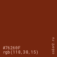 Цвет #76260F в цветовой модели RGB обозначается тремя октетами (118, 38, 15) в десятичном формате и #76260F в шестнадцатиричном (hex) формате, которые являются интенсивностью красного 118 (hex 76), интенсивность зелёного 38 (hex 26) и интенсивность синего 15 (hex 0F).