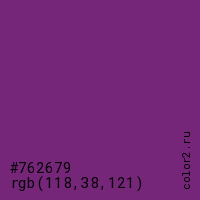 Цвет #762679 в цветовой модели RGB обозначается тремя октетами (118, 38, 121) в десятичном формате и #762679 в шестнадцатиричном (hex) формате, которые являются интенсивностью красного 118 (hex 76), интенсивность зелёного 38 (hex 26) и интенсивность синего 121 (hex 79).