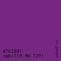 Цвет #762881 в цветовой модели RGB обозначается тремя октетами (118, 40, 129) в десятичном формате и #762881 в шестнадцатиричном (hex) формате, которые являются интенсивностью красного 118 (hex 76), интенсивность зелёного 40 (hex 28) и интенсивность синего 129 (hex 81).