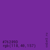 Цвет #76289D в цветовой модели RGB обозначается тремя октетами (118, 40, 157) в десятичном формате и #76289D в шестнадцатиричном (hex) формате, которые являются интенсивностью красного 118 (hex 76), интенсивность зелёного 40 (hex 28) и интенсивность синего 157 (hex 9D).