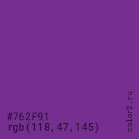 Цвет #762F91 в цветовой модели RGB обозначается тремя октетами (118, 47, 145) в десятичном формате и #762F91 в шестнадцатиричном (hex) формате, которые являются интенсивностью красного 118 (hex 76), интенсивность зелёного 47 (hex 2F) и интенсивность синего 145 (hex 91).