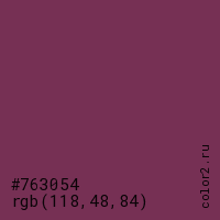Цвет #763054 в цветовой модели RGB обозначается тремя октетами (118, 48, 84) в десятичном формате и #763054 в шестнадцатиричном (hex) формате, которые являются интенсивностью красного 118 (hex 76), интенсивность зелёного 48 (hex 30) и интенсивность синего 84 (hex 54).