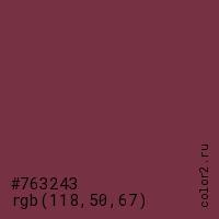 Цвет #763243 в цветовой модели RGB обозначается тремя октетами (118, 50, 67) в десятичном формате и #763243 в шестнадцатиричном (hex) формате, которые являются интенсивностью красного 118 (hex 76), интенсивность зелёного 50 (hex 32) и интенсивность синего 67 (hex 43).