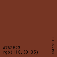 Цвет #763523 в цветовой модели RGB обозначается тремя октетами (118, 53, 35) в десятичном формате и #763523 в шестнадцатиричном (hex) формате, которые являются интенсивностью красного 118 (hex 76), интенсивность зелёного 53 (hex 35) и интенсивность синего 35 (hex 23).