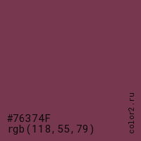 Цвет #76374F в цветовой модели RGB обозначается тремя октетами (118, 55, 79) в десятичном формате и #76374F в шестнадцатиричном (hex) формате, которые являются интенсивностью красного 118 (hex 76), интенсивность зелёного 55 (hex 37) и интенсивность синего 79 (hex 4F).