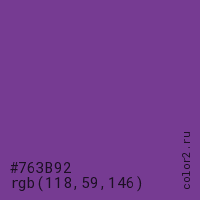 Цвет #763B92 в цветовой модели RGB обозначается тремя октетами (118, 59, 146) в десятичном формате и #763B92 в шестнадцатиричном (hex) формате, которые являются интенсивностью красного 118 (hex 76), интенсивность зелёного 59 (hex 3B) и интенсивность синего 146 (hex 92).