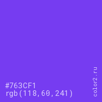 Цвет #763CF1 в цветовой модели RGB обозначается тремя октетами (118, 60, 241) в десятичном формате и #763CF1 в шестнадцатиричном (hex) формате, которые являются интенсивностью красного 118 (hex 76), интенсивность зелёного 60 (hex 3C) и интенсивность синего 241 (hex F1).