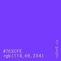 Цвет #763CFE в цветовой модели RGB обозначается тремя октетами (118, 60, 254) в десятичном формате и #763CFE в шестнадцатиричном (hex) формате, которые являются интенсивностью красного 118 (hex 76), интенсивность зелёного 60 (hex 3C) и интенсивность синего 254 (hex FE).