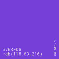 Цвет #763FD8 в цветовой модели RGB обозначается тремя октетами (118, 63, 216) в десятичном формате и #763FD8 в шестнадцатиричном (hex) формате, которые являются интенсивностью красного 118 (hex 76), интенсивность зелёного 63 (hex 3F) и интенсивность синего 216 (hex D8).