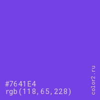 Цвет #7641E4 в цветовой модели RGB обозначается тремя октетами (118, 65, 228) в десятичном формате и #7641E4 в шестнадцатиричном (hex) формате, которые являются интенсивностью красного 118 (hex 76), интенсивность зелёного 65 (hex 41) и интенсивность синего 228 (hex E4).