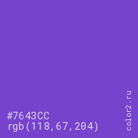 Цвет #7643CC в цветовой модели RGB обозначается тремя октетами (118, 67, 204) в десятичном формате и #7643CC в шестнадцатиричном (hex) формате, которые являются интенсивностью красного 118 (hex 76), интенсивность зелёного 67 (hex 43) и интенсивность синего 204 (hex CC).